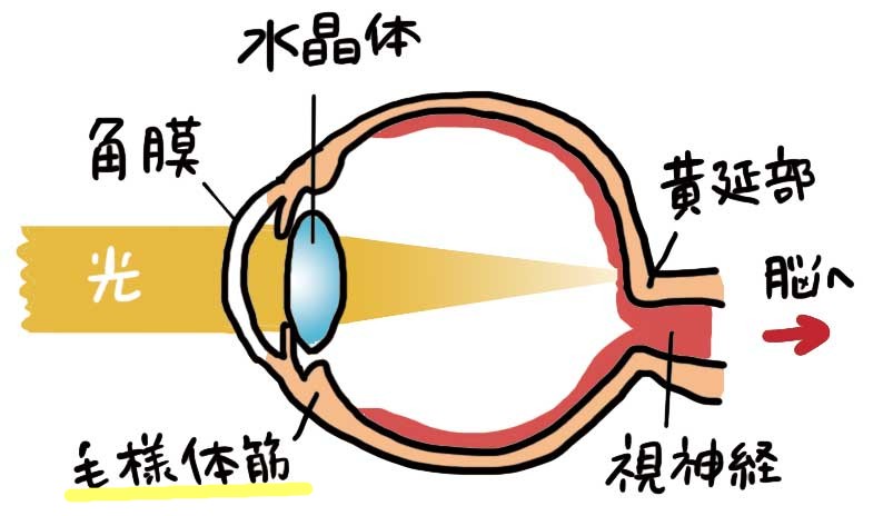 眼精疲労は、近くばかりを見すぎることによる毛様体筋の緊張が原因とされています。毛様体筋は目の中にある筋肉で、水晶体の厚さを変えてピントを合わせています。近くを見る際には水晶体を厚くするために毛様体筋が緊張しますが、長時間の画面作業などで毛様体筋が疲れてしまうと、眼精疲労が進行します。