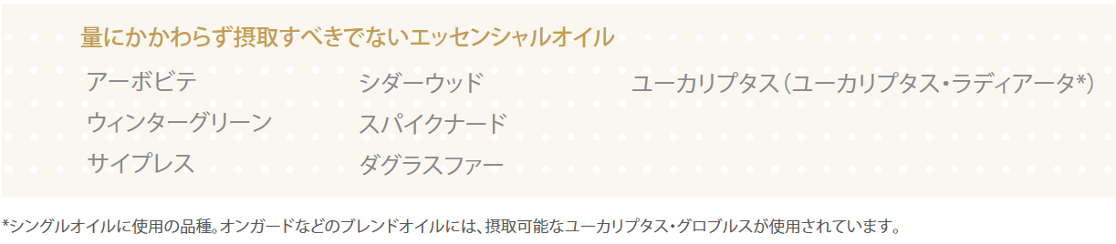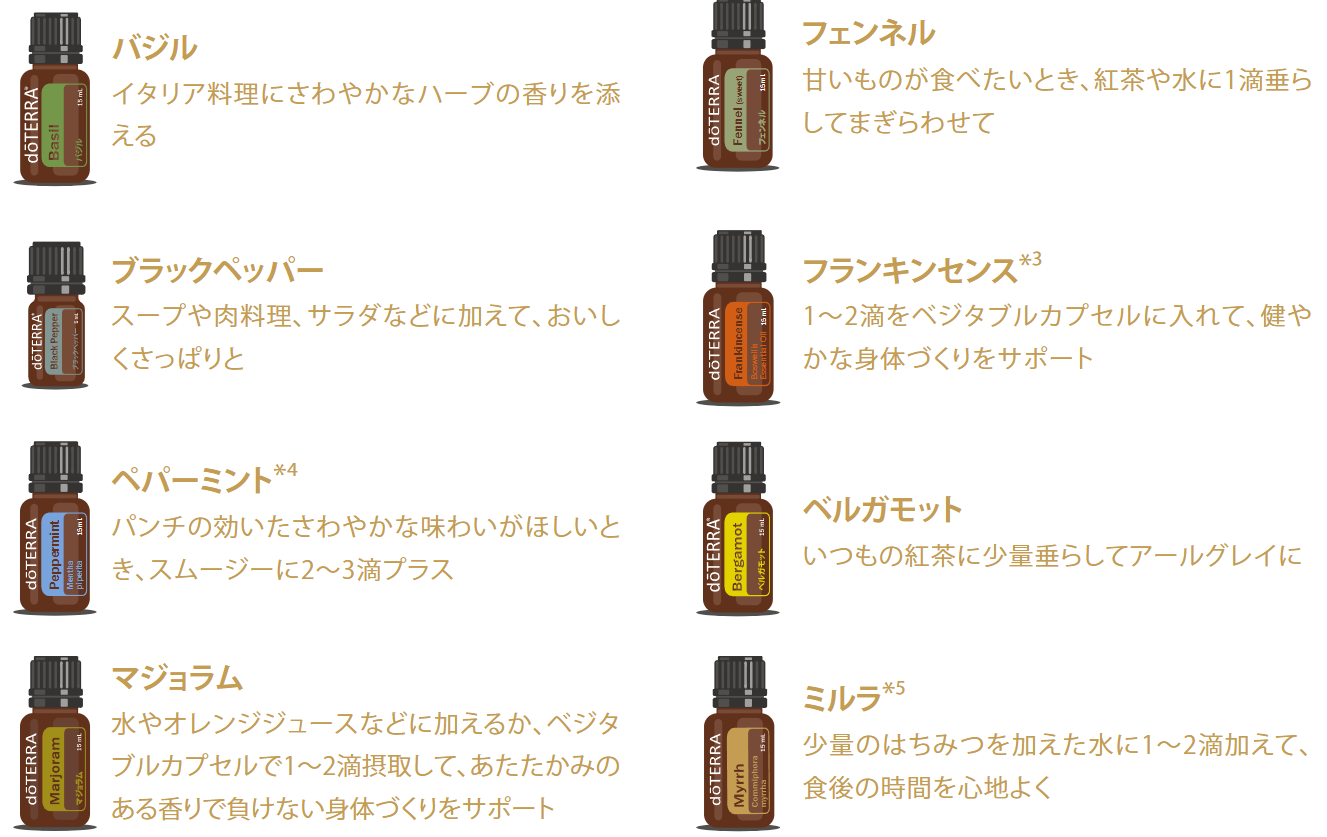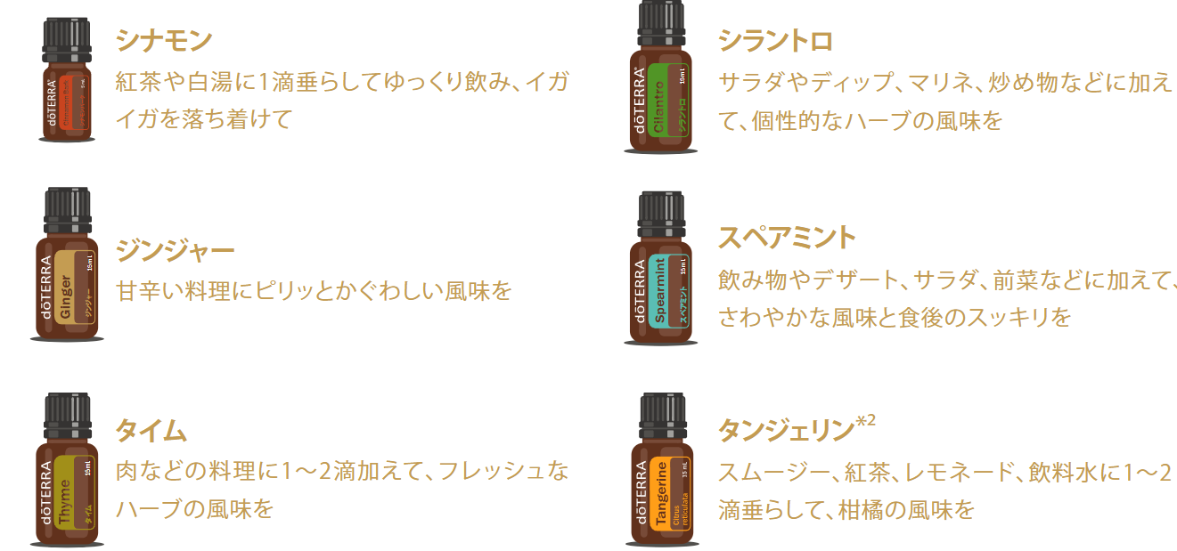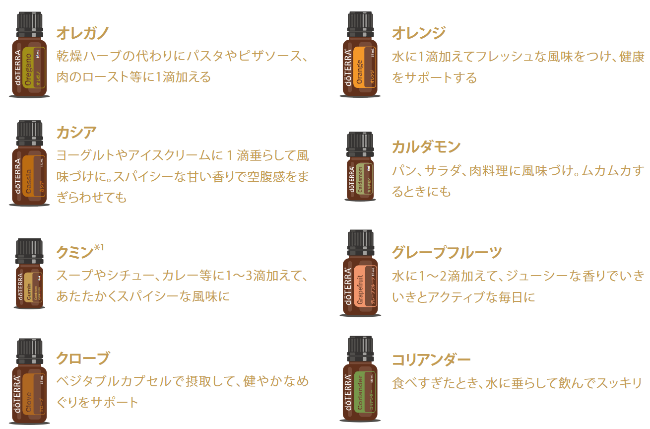 全てのエッセンシャルオイルが摂取できるわけではなく、ドテラのアロマオイルの中でも「食品添加物」の表示があるものだけです。
