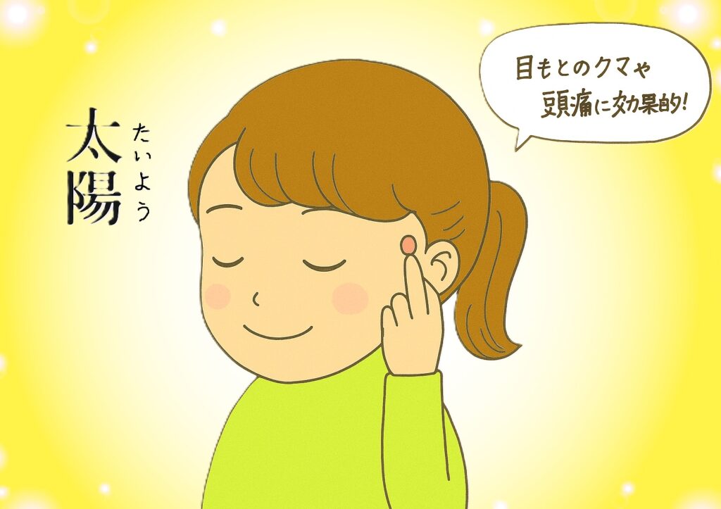 太陽(たいよう):眉尻と目尻の間のくぼみ。こめかみのズキズキに。