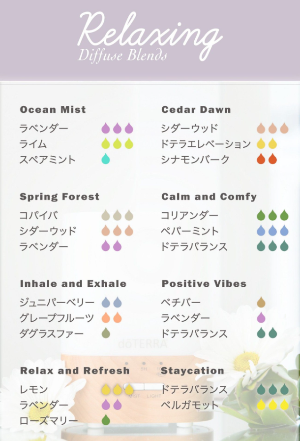 ラベンダー、ウェーブリズム、アースリズムなどの癒やし系オイルと合わせて【デュフューズ】すれば、ゆったりしたリラクゼーションタイムに♪